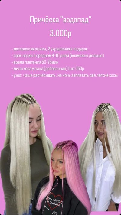 | Коса водопад | от 3000 ₽ за усл. |
